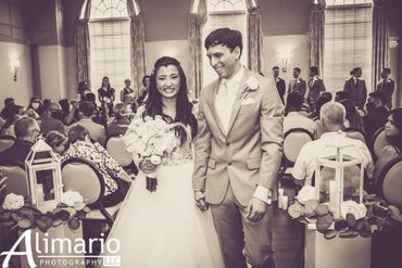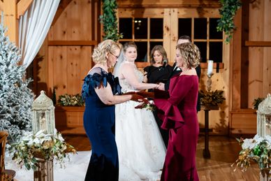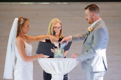The couple pours different colored sands from their own vessels into a single container. The different colors symbolize the couple's separate lives, while the act of pouring the sands together represents the blending of their lives into one. Can also include parents and/or children.