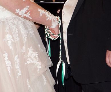 Handfasting is a wedding ceremony ritual that symbolizes a couple's commitment to each other by tying their hands together ultimately producing an infinity knot. The tradition has roots in Celtic customs, and its often associated with Ireland and Scotland.
